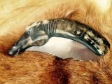Le manche est en corne de bellier tete de sanglier sculptée.Ce modèle est pliant.
